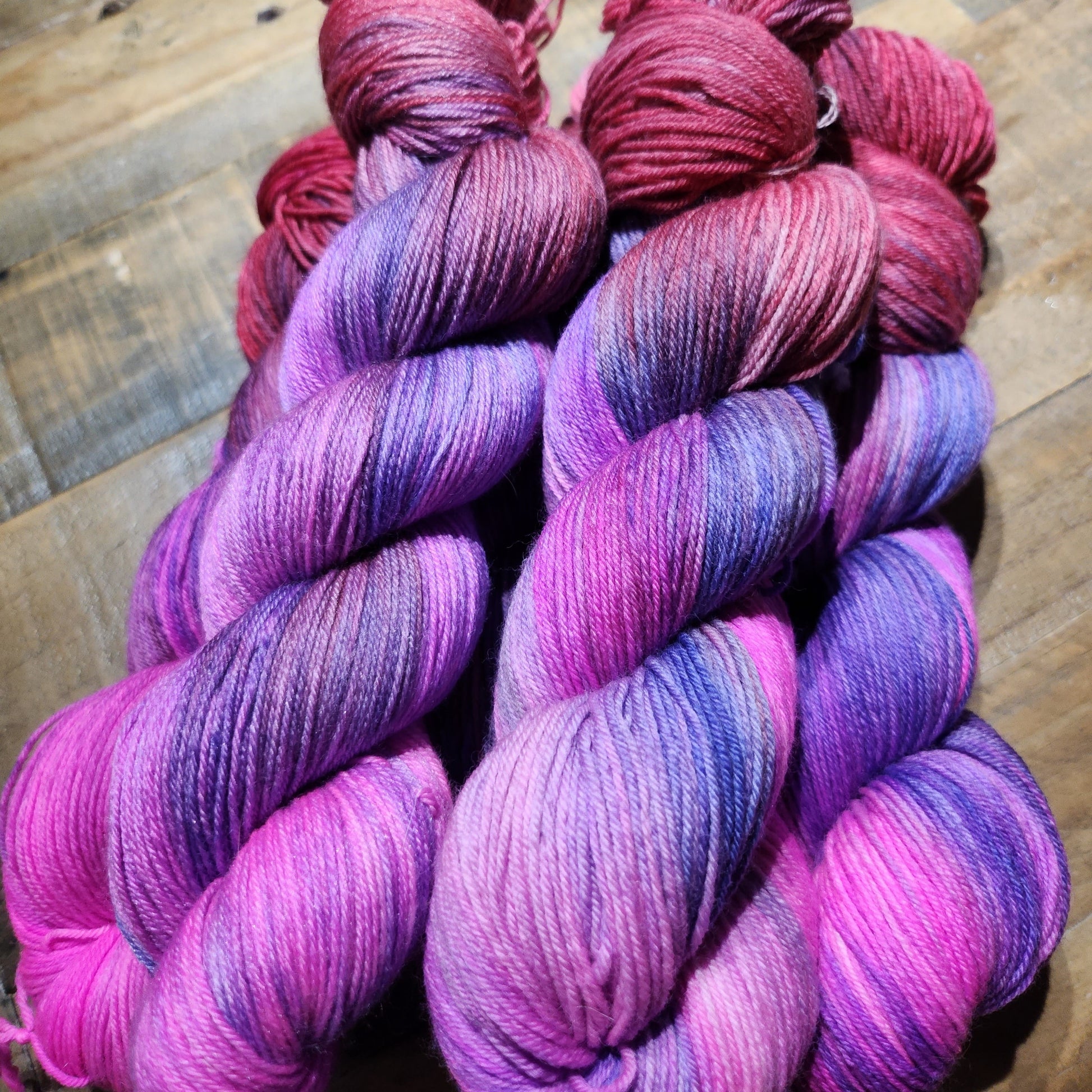 'Cosmic' A fun yarn playing with various shades of hot pink, cherry red and periwinkle.