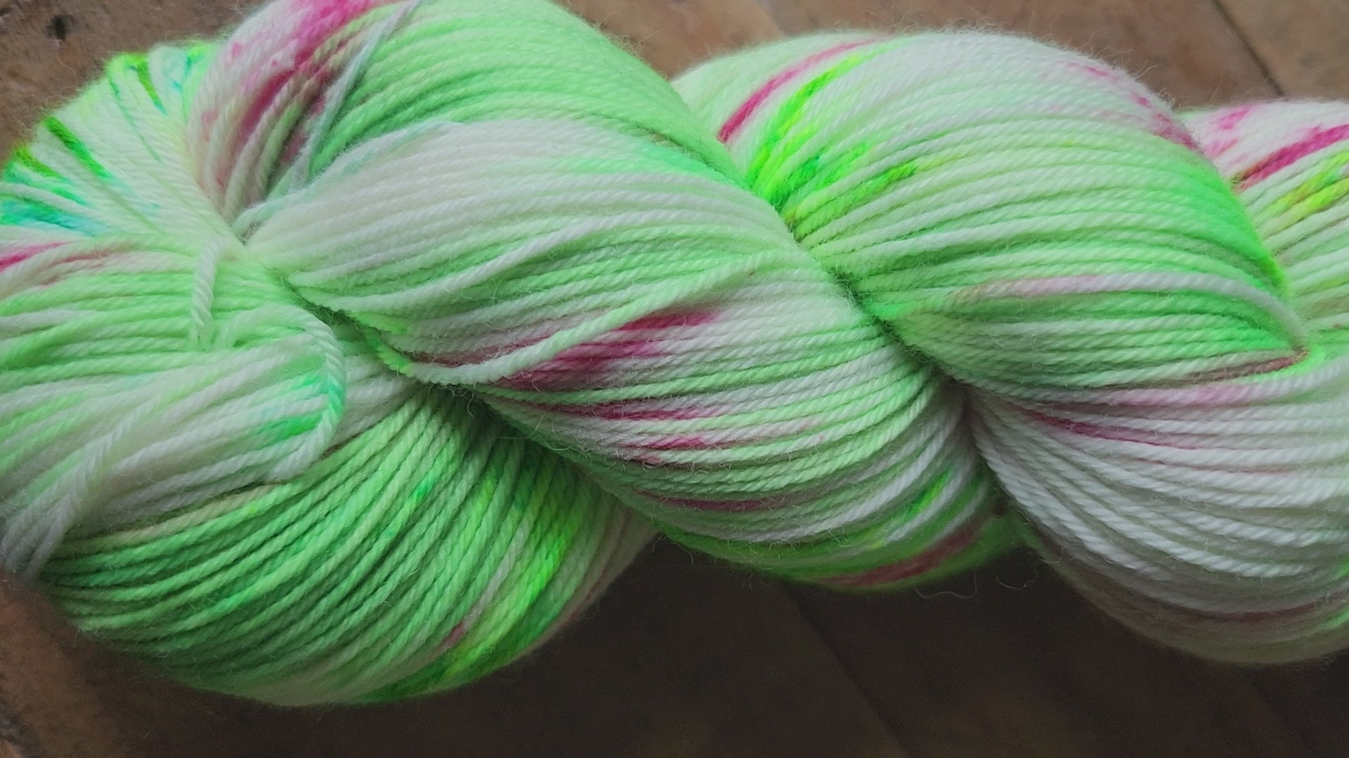 Neon Greens, Hot Pinks and a touch of Blue on a white base. A bright and fun yarn for Spring.