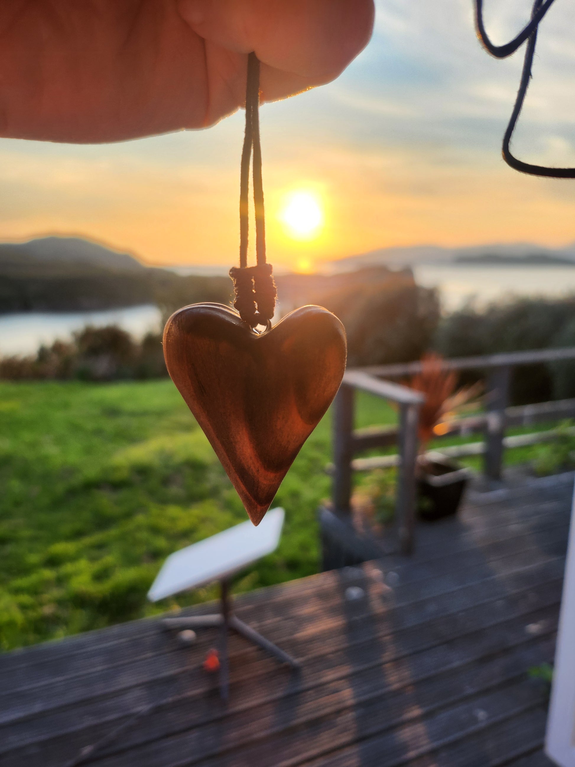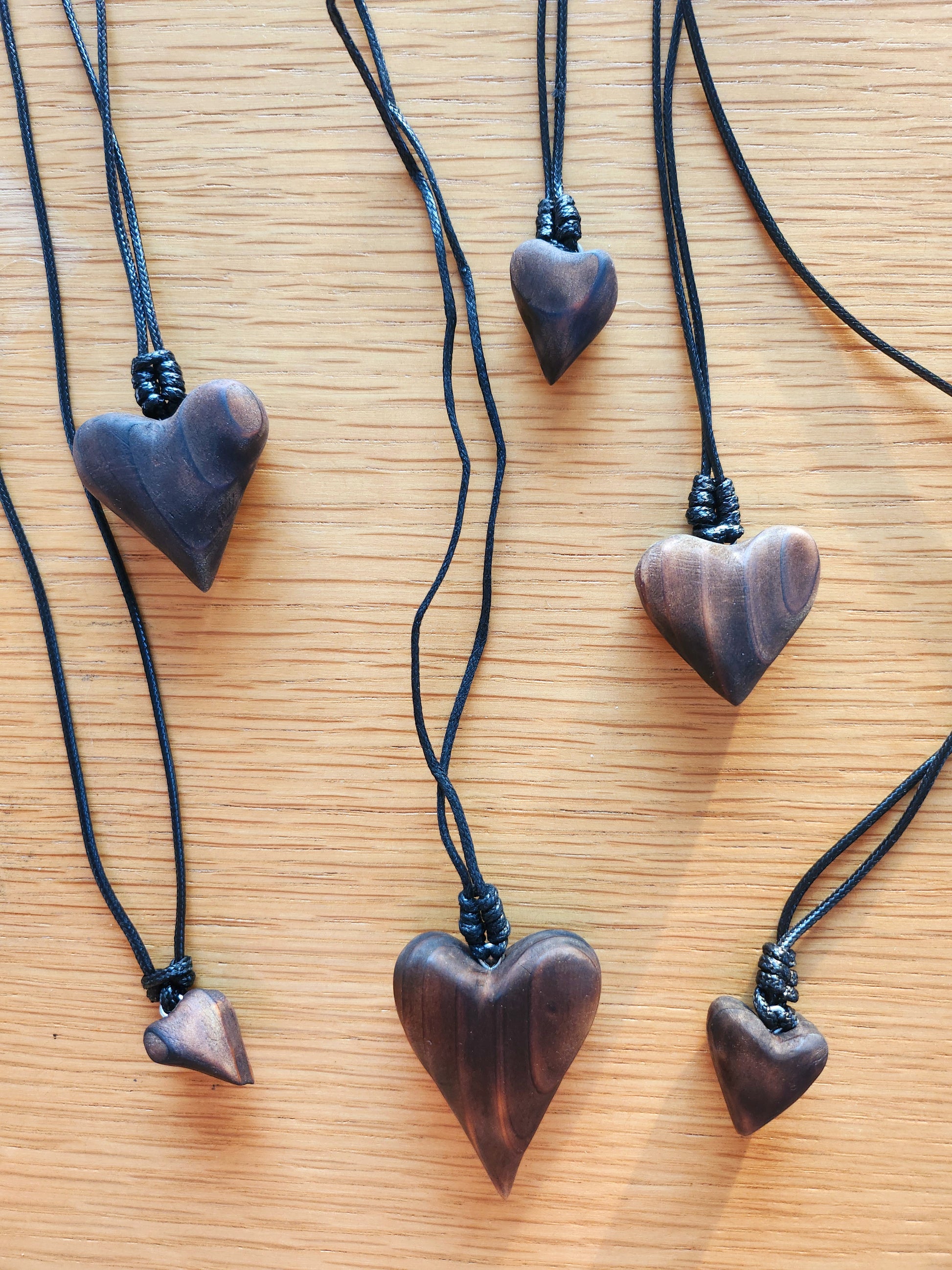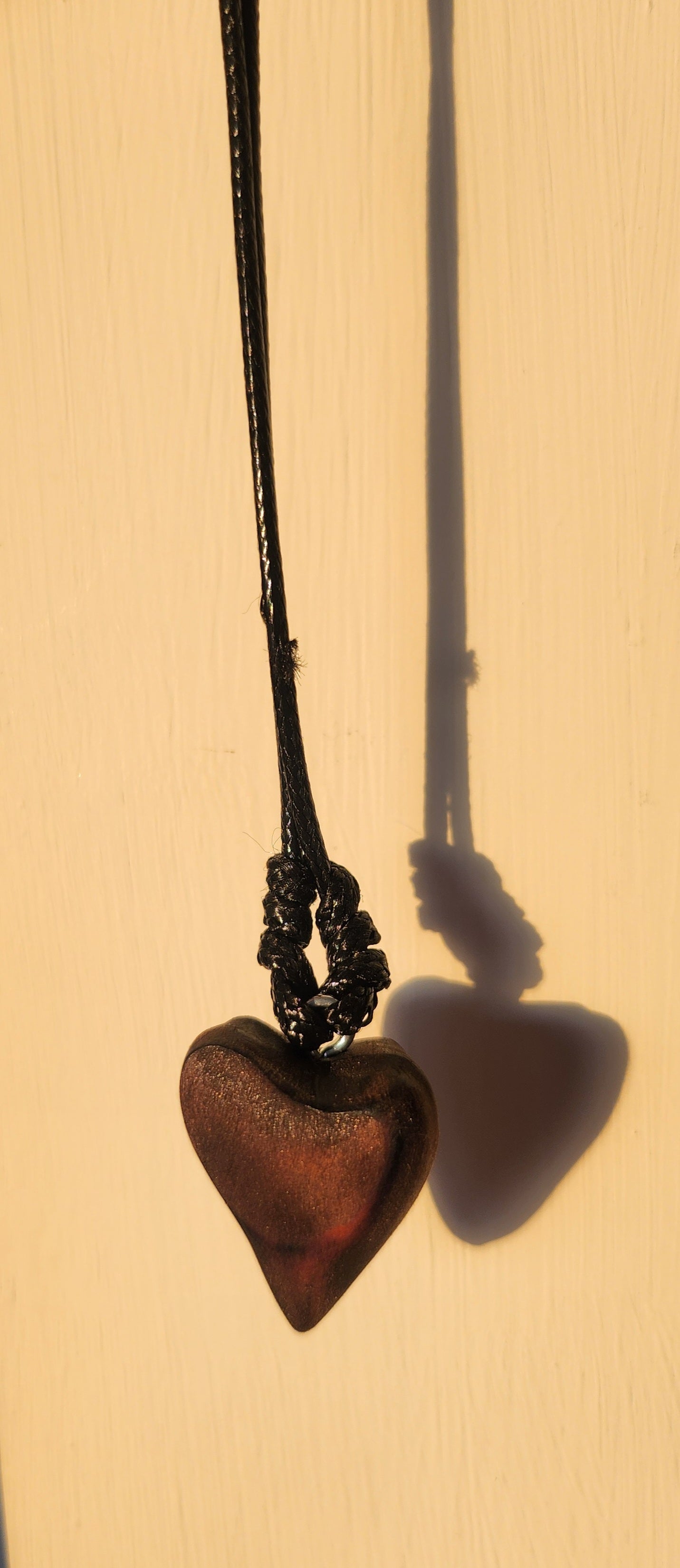 A heart shaped pendant hand carved from reclaimed wood by An Carn Crafts on a waxed cotton cord with a sliding knot for adjustable length.
